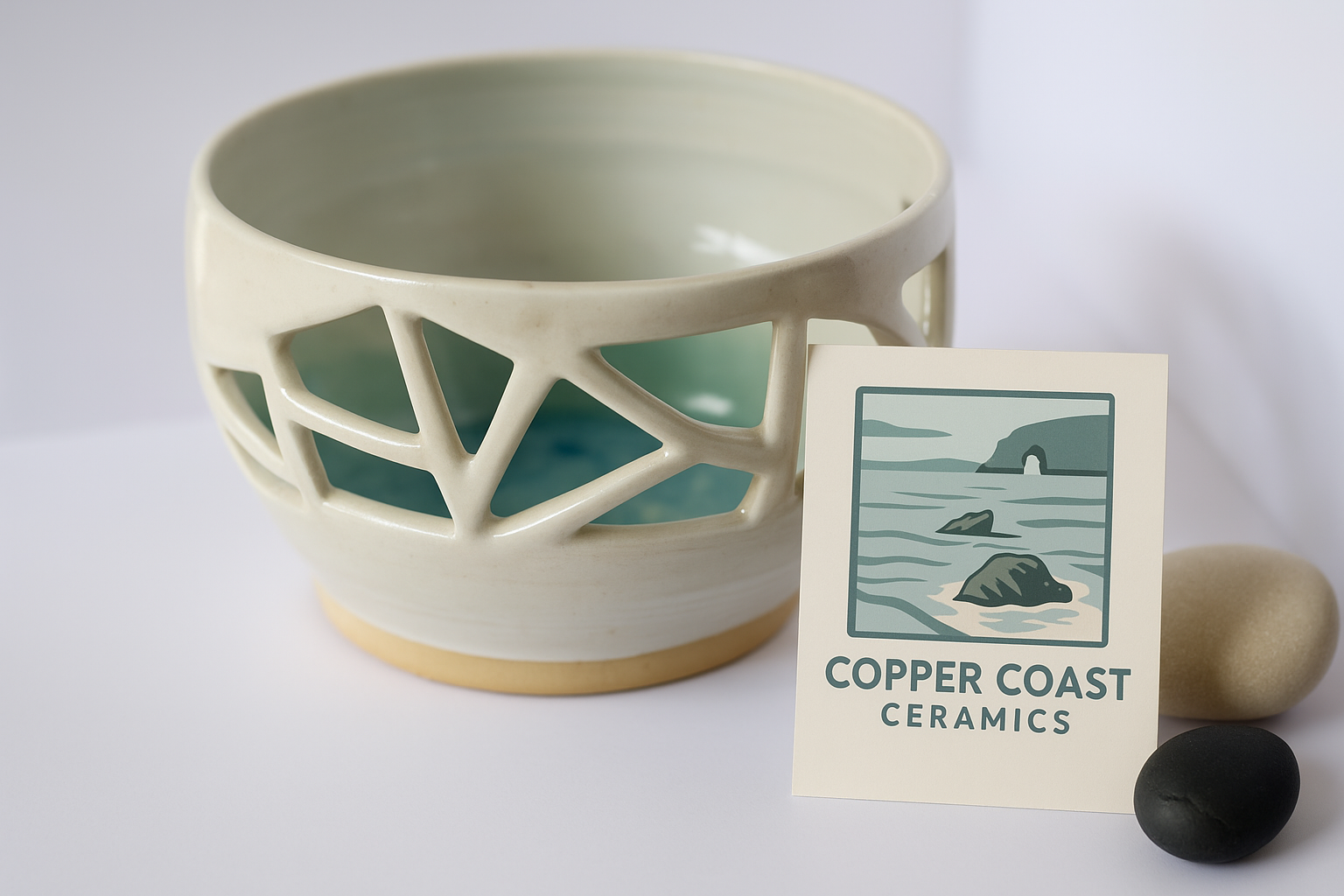 - AI-Assisted Hero Image Creation: The primary visual for the website’s hero section was crafted by the user uploading one of their photographs to GPT-4o. The AI was then instructed to digitally integrate a card displaying the “Copper Coast Ceramics” logo into this image, resulting in the final